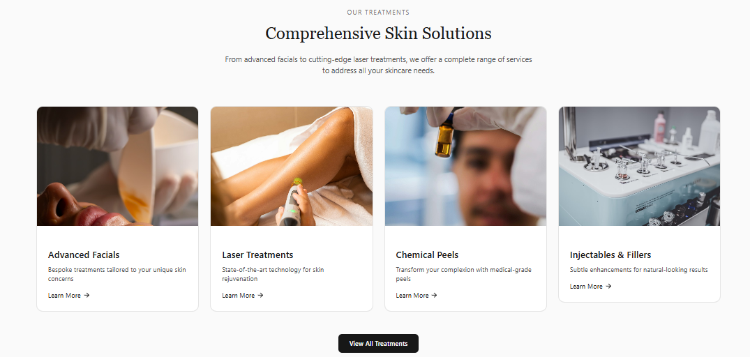 Treatments are structured in a clean, card-based layout, allowing users to easily scan and understand what’s offered. Each service is positioned to feel specialised, not generic.